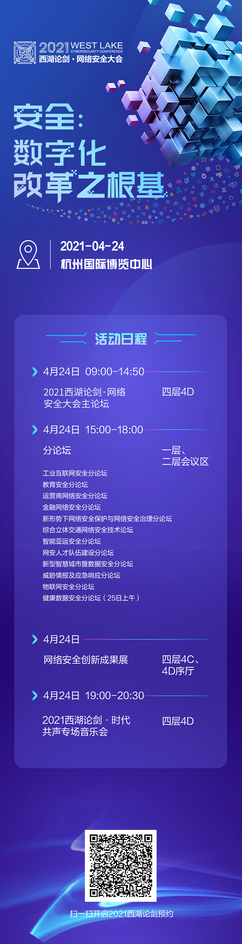 开启“十四五”,奋进新征程。2021西湖论剑·网络安全大会将以“安全:数字化改革之根基”为主题,于2021年4月24日在杭州举办。作为“十四五”开局之年首场顶级网络安全盛会,本届西湖论剑将面对网络安全治理的国际新形势,站在高起点从我国网络安全保障体系和能力建设的任务出发,为夯实网络安全保障体系和能力建设的基础,营造更加良好的网络安全环境目标而推进。