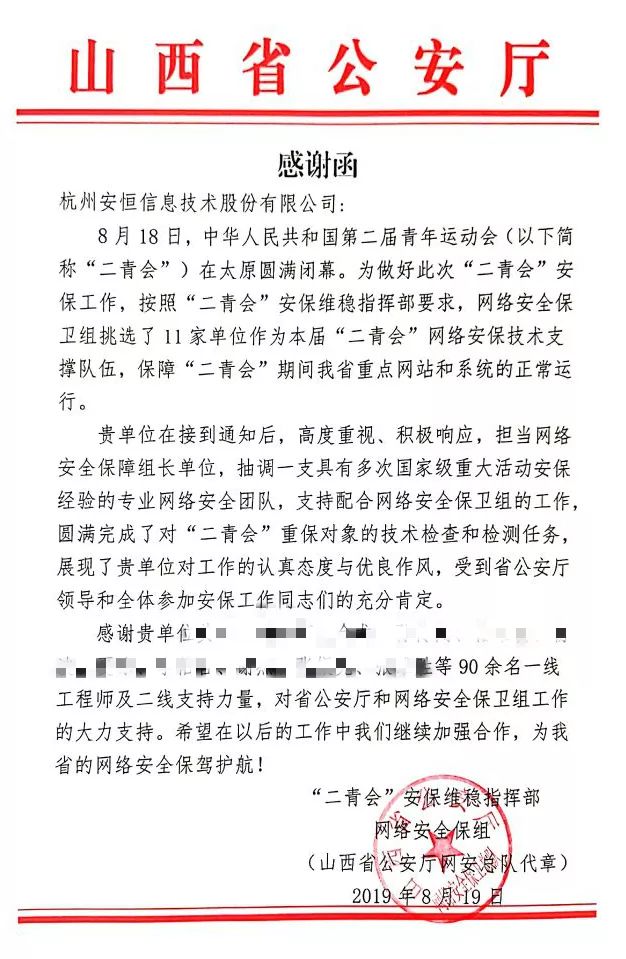 感谢信 | 安恒信息任“二青会”网络安保组长单位,圆满完成任务!