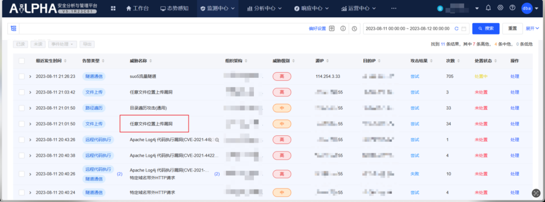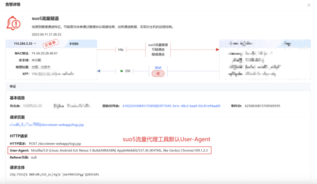 2023-08-11 21时20分,平台出现suo5隧道通信告警,告警源IP为114.254.3.33,被攻击系统为xx集团xx综合办公系统,一侠士发现后及时提报了该事件。