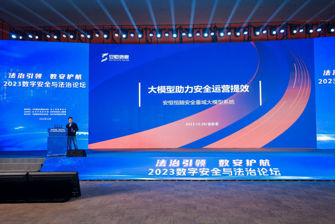 12月28日,“2023数字安全与法治论坛”在浙江杭州举办。中国网络空间安全协会理事长赵泽良出席论坛并致辞,中国科学院院士管晓宏,中央网信办法治局、杭州市委宣传部、杭州市余杭区有关负责同志等出席论坛并作主题演讲。安恒信息作为中国网络空间安全协会的理事单位,积极参与本次论坛,并由人工智能专家发表了题为《大模型助力安全运营提效》的主题演讲。
