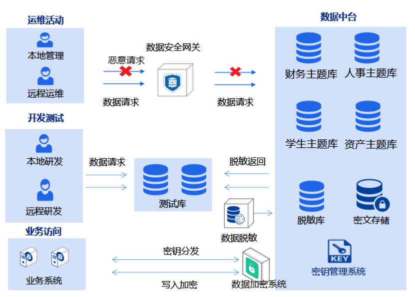 2.以敏感数据为中心,综合访问控制、数据库安全、存储加密、数据脱敏系列技术栈,构筑立体化数据安全防护体系。