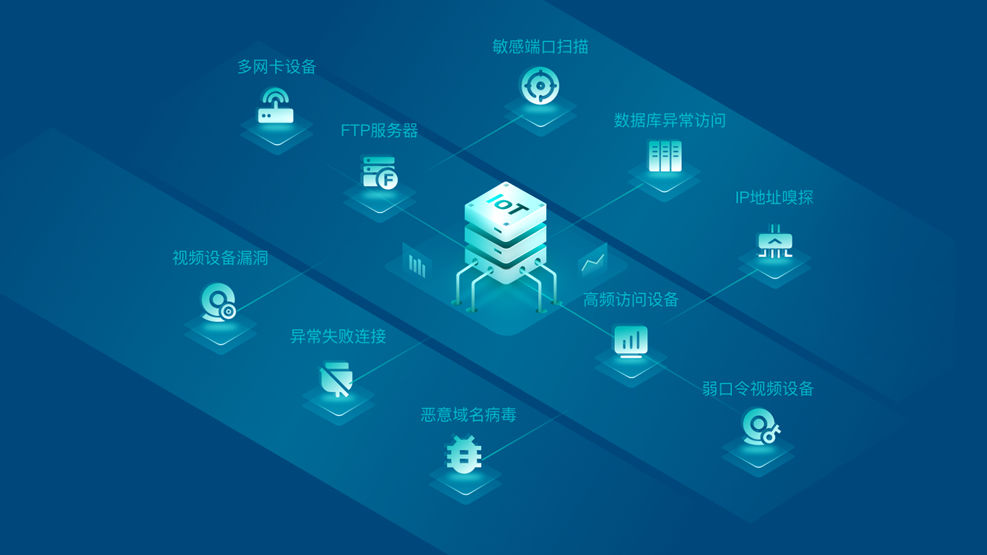 从用户物联网终端的资产出发,关注物联网终端资产状态、违规行为、弱口令、系统漏洞等威胁信息,并且及时发现突破、绕过现有安全防御机制的风险行为,实时主动监测、预警威胁信息与风险行为