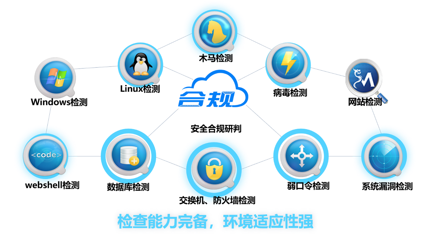 明鉴®信息安全等级保护检查工具箱是在深入分析与研究常见安全漏洞以及流行的攻击技术基础上,通过安恒安全团队攻防研究和风险评估项目经验并结合信息安全等级保护相关标准总结归纳大量的安全漏洞信息和攻击方式后,研制开发的针对物理安全、主机安全、网络安全、应用安全、数据库安全等系统及配置检查,以及支持对管理安全层面检查,检查内容支持自定义筛选导出填写后导入。实现对信息系统“定级、备案、测评、整改、安全自查和监督检查”全过程的监督管理。