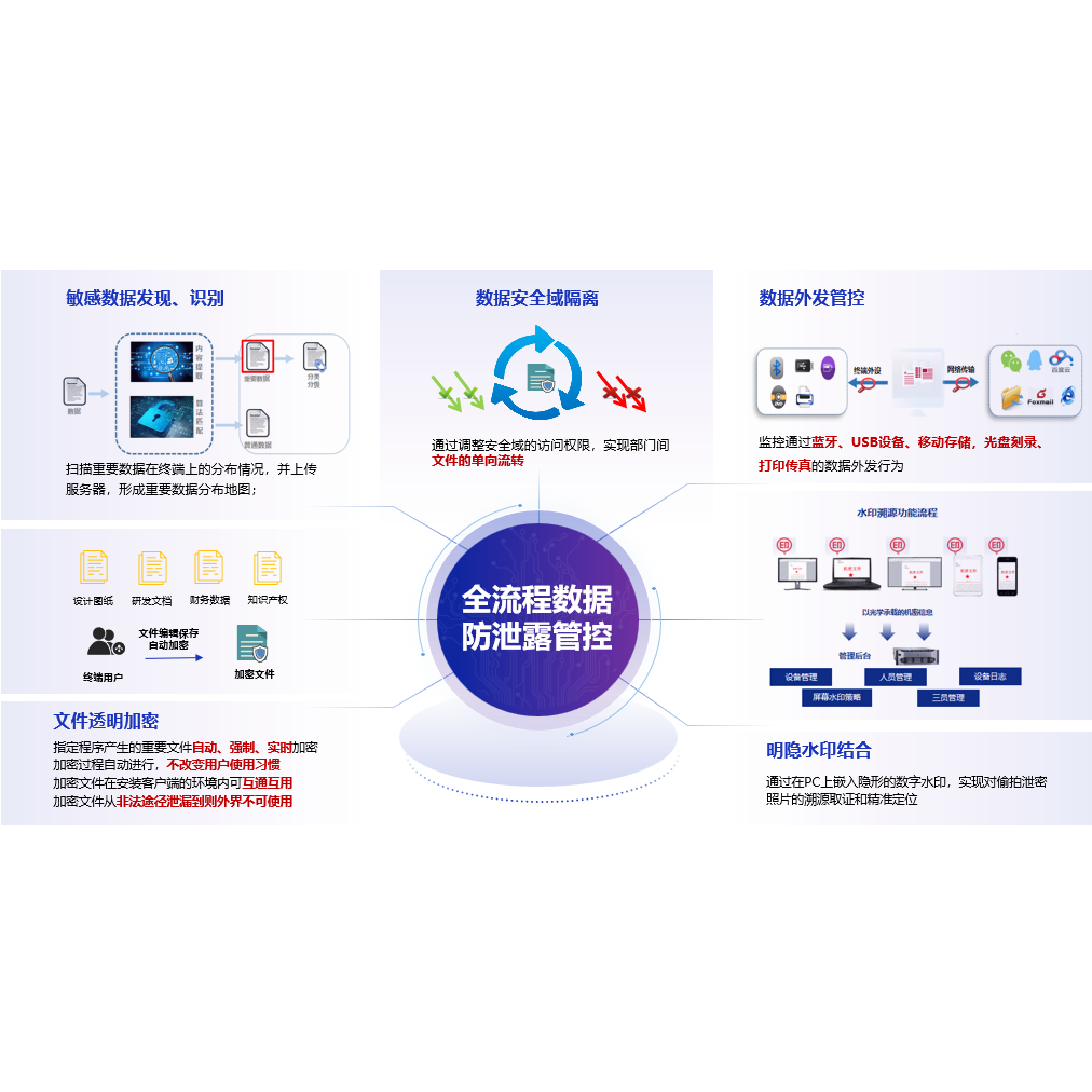 以数据安全技术为核心,具备内容识别技术、边界防护技术、动态防护技术为核心,对终端用户的各种操作行为进行监控,结合先进的指纹匹配技术、自然语义分析、机器学习等智能算法,准确识别出终端上的敏感数据、重要数据及数据安全风险行为,并根据策略进行相应的管控,从根本上为用户解决数据泄漏难题。