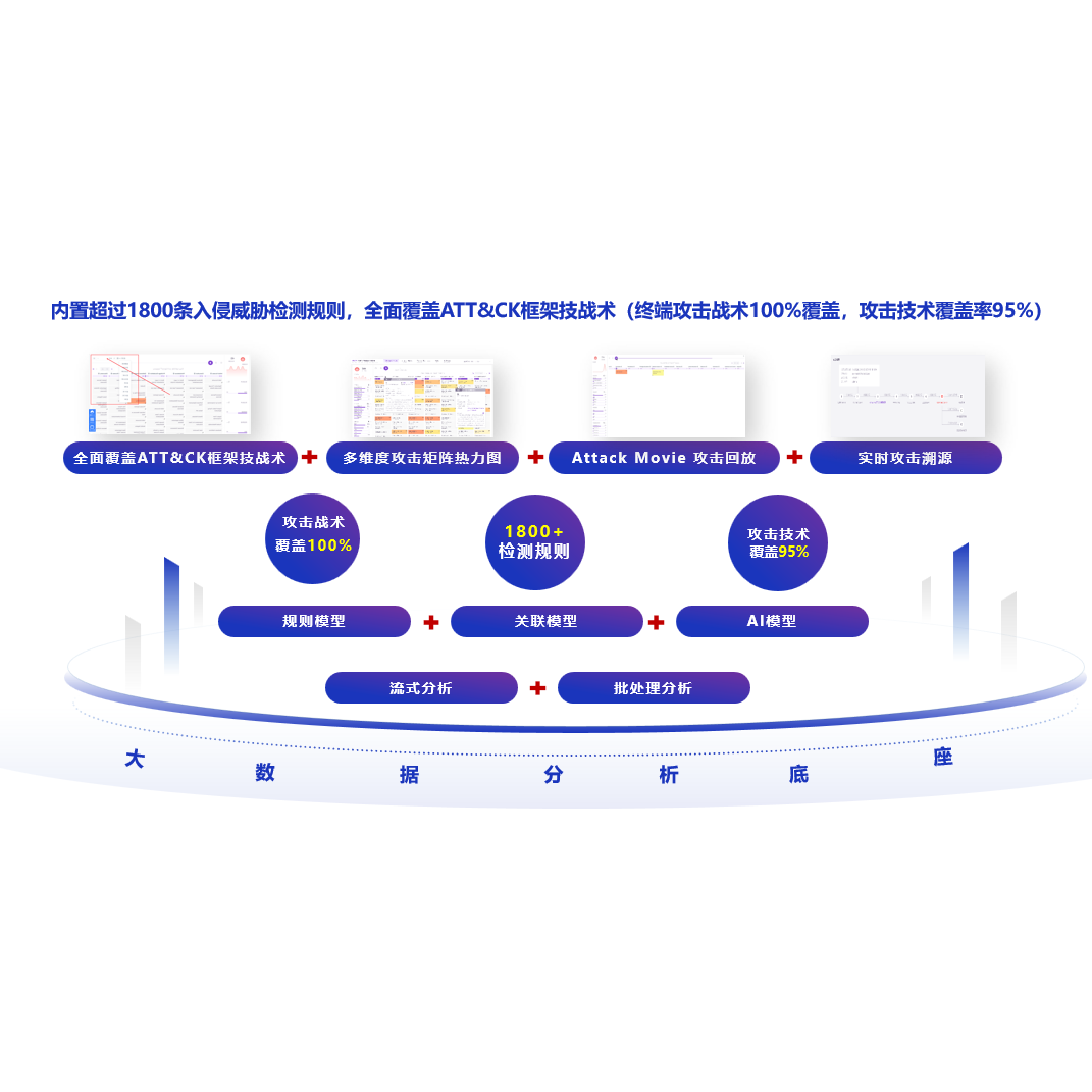 安恒一体化平台内置了超过1800条入侵威胁检测规则,全面覆盖Mitre attack攻击框架。在规则模型+关联模型+AI模型等多维分析模型的加持下能实现对海量终端安全事件的分析,针对入侵行为进行全链路秒级告警、自动响应。