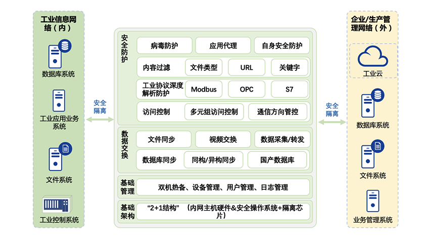 基于对工业协议进行安全深度解析过滤以及数据的隔离摆渡,保护工业控制网络以及过程监控层与现场控制层网络。确保业务数据交换的实时性、连续性以及安全性,阻断外部的非法访问及攻击,维护网络安全以及数据的保密性。
