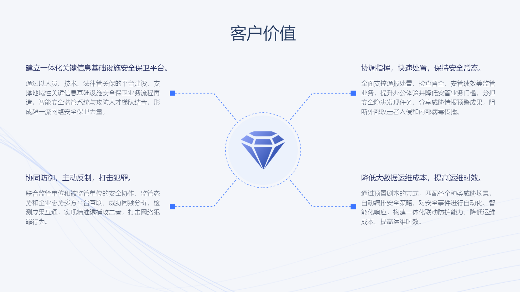 AiLPHA大数据态势感知平台主要面向监管、行业主管部门和关键信息基础设施运营使用单位,平台以云为基础架构,以大数据为技术支撑,以关键信息基础设施全生命周期数据治理为核心,以重要系统全息档案、安全保卫人员全息档案和网络攻击武器及手段情报档案为抓手,纵向贯通、横向联动、智慧高效、搭建城市级安全监管运营体系,实现网络空间安全综合治理、全网固证提取溯源、跨组织安管协作三大能力。